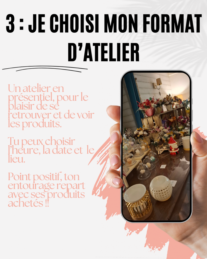 2. Jusqu’à un produit à -20% Si le jour de votre atelier, l’un de vos invités (ou vous-même !) reprogramme un atelier, vous bénéficiez d’un produit à -20% au choix.