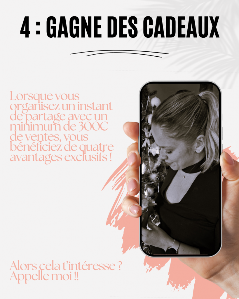 Lorsque vous organisez un instant de partage avec un minimum de 300€ de ventes, vous bénéficiez de quatre avantages exclusifs !